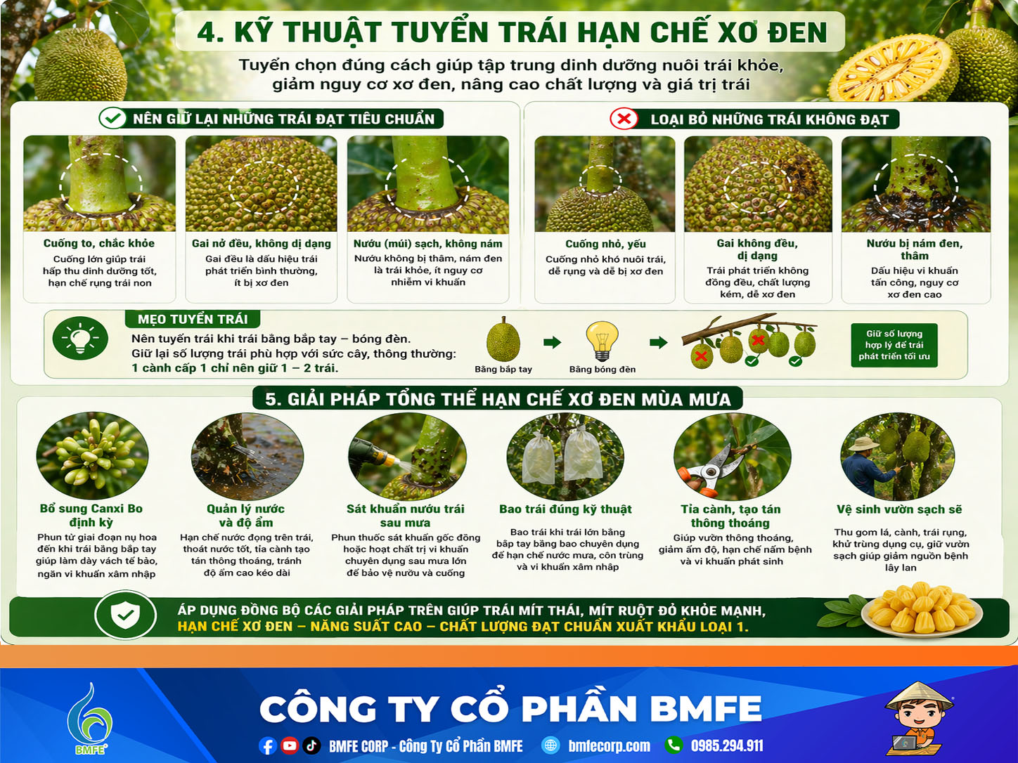 Bổ sung Canxi Bo định kỳ: Đây là bước quan trọng nhất. Bà con nên phun canxi bo cho mít từ giai đoạn nụ hoa đến khi trái đậu bằng bắp tay. Canxi giúp làm dày vách tế bào, giúp trái cứng cáp và ngăn chặn sự xâm nhập của vi khuẩn qua nướu.