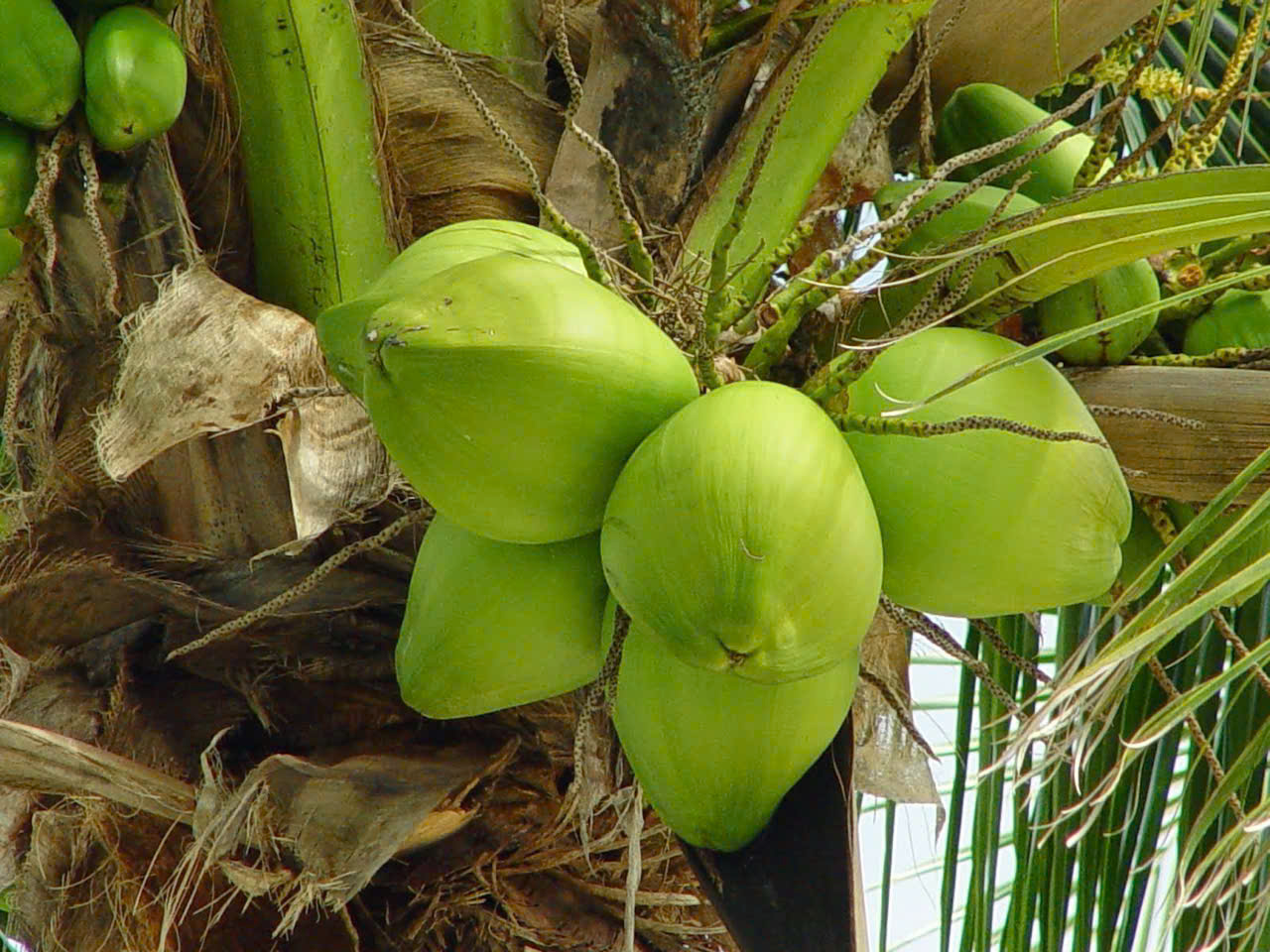 Quả dừa: có lớp vỏ xơ, cùi trắng và nước dừa ngọt mát giàu khoáng chất.