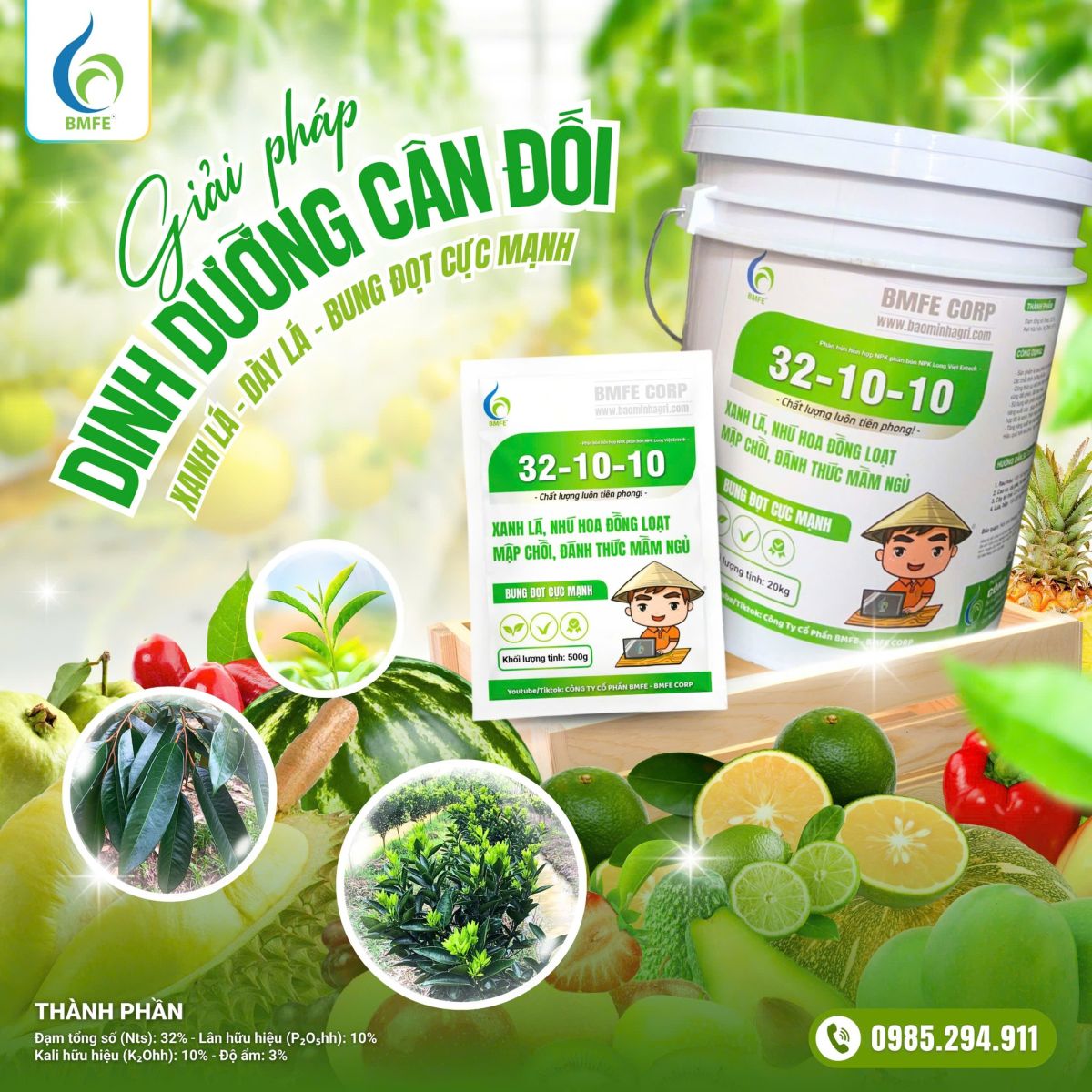 Đối với giai đoạn đầu vụ, việc thúc đẩy sinh trưởng và phát triển bộ tán là yếu tố then chốt quyết định sức khỏe và năng suất của cây trồng. Hiểu được điều đó, BMFE giới thiệu sản phẩm NPK 32-10-10 – giải pháp dinh dưỡng chuyên sâu, giúp cây trồng xanh tốt, ra chồi mạnh, bung đọt khỏe và đánh thức các mầm ngủ hiệu quả.